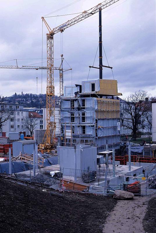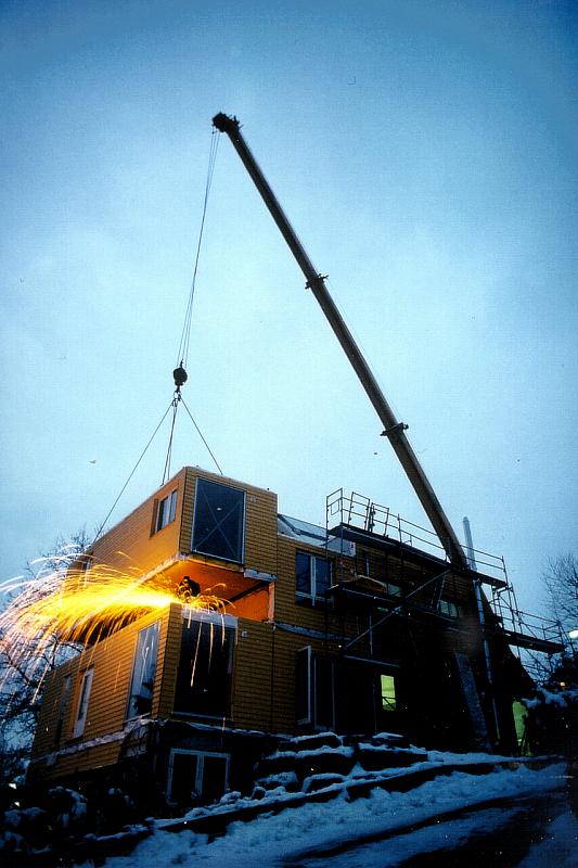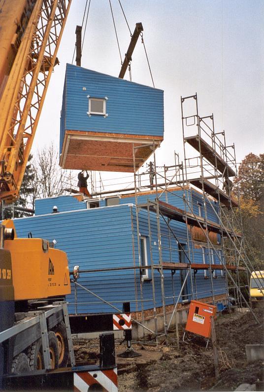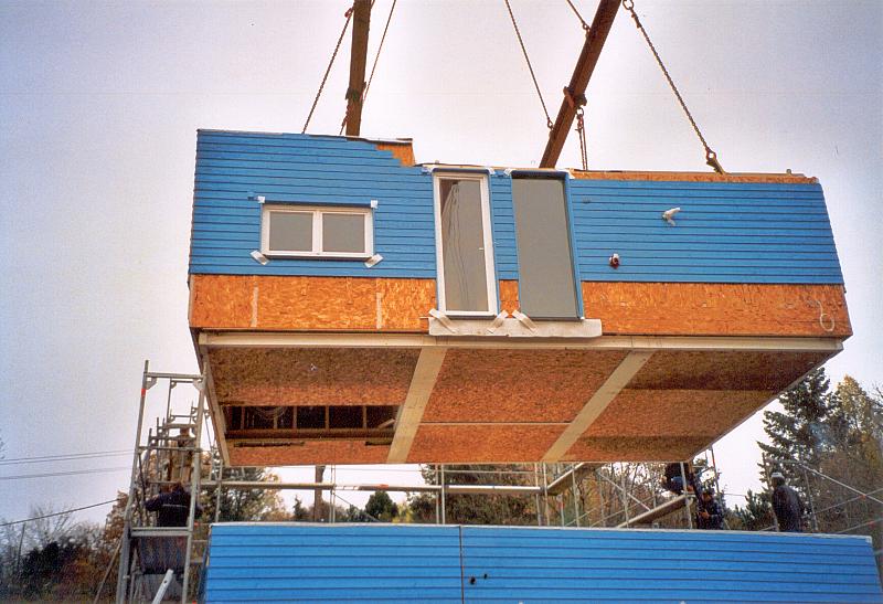 Die Module sind inklusive Boden- und Wandbelägen, Fenster, Türen, fertige Bäder, Heizungs- und Elektroinstallation nahezu fertiggestellt, bevor der Transport zum Bauort beginnt. "Baustelle" ist hier eigentlich die Fabrikhalle! Am Bau werden lediglich noch die Sonnenkollektoren eingebaut. Abschließend wird das Dach bepflanzt und die Aussenanlage fertiggestellt.